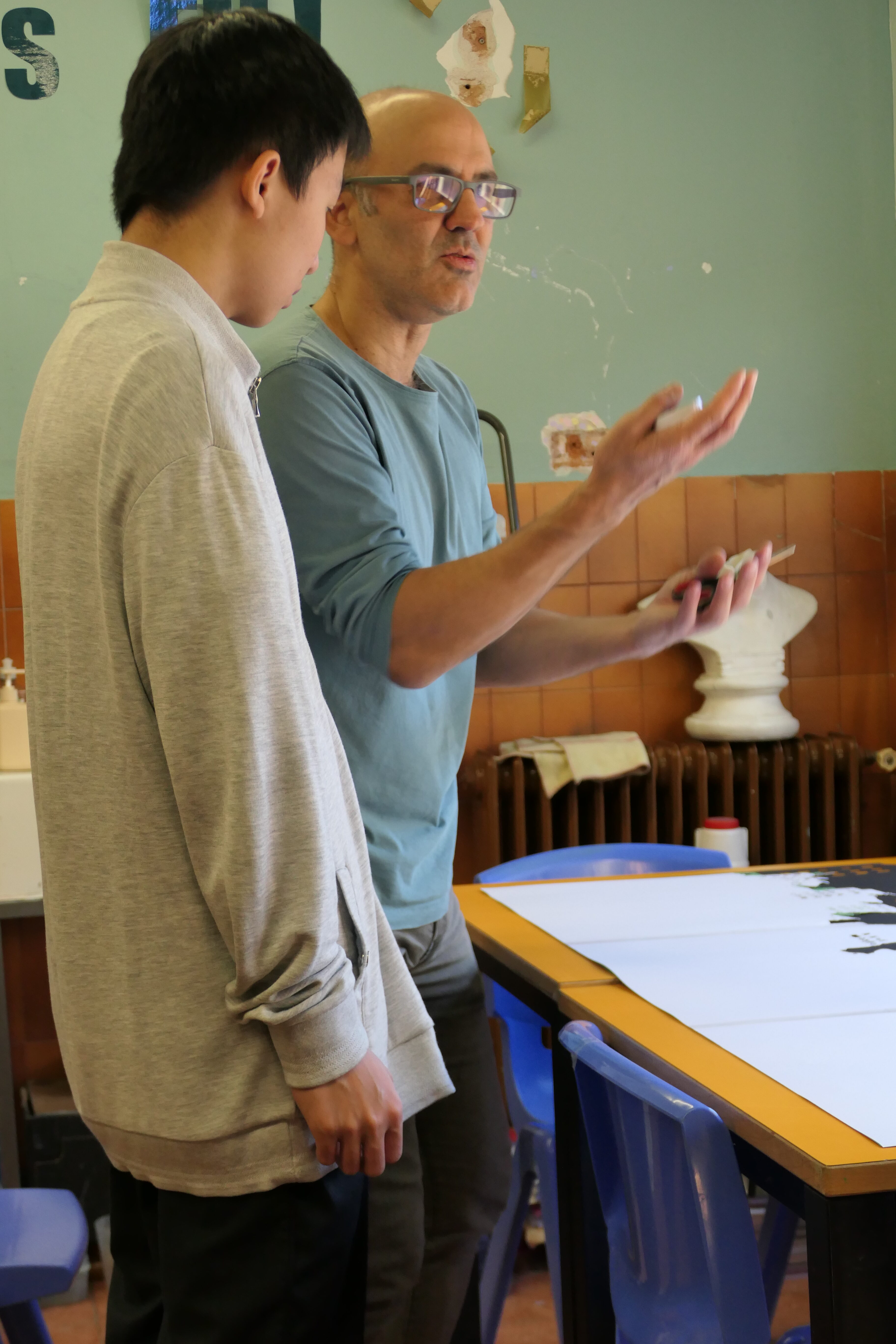 Pau Baya, professor de visual i plàstica de l'Escola ens explica la feina que hi ha al darrere del pessebre de l'Escola. Un repte que comparteix amb la Susana Oliveros, professora de l'Escola i amb tot l'alumnat que hi ha participat els darrers cursos.